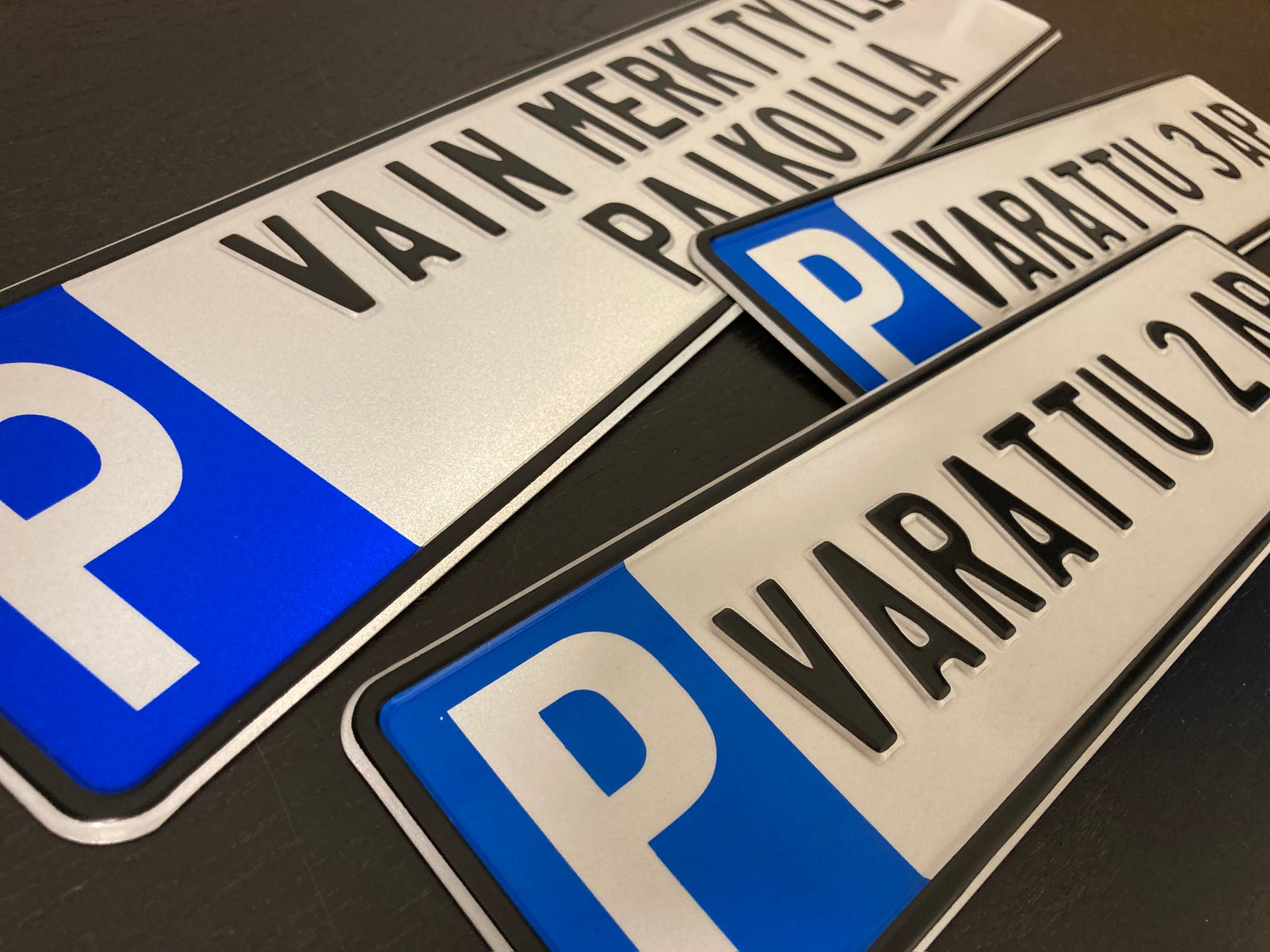 Tekstinä kilvessä voidaan käyttää rekisterinumeroa tai enemmän persoonallisempaa vaihtoehtoa kuten henkilön lempinimeä. Suosituimpia tekstejä kylttiin ovat asiakkaidemme keskuudessa olleet: VIERAS, VARATTU, BMW ONLY, AUDI ONLY.