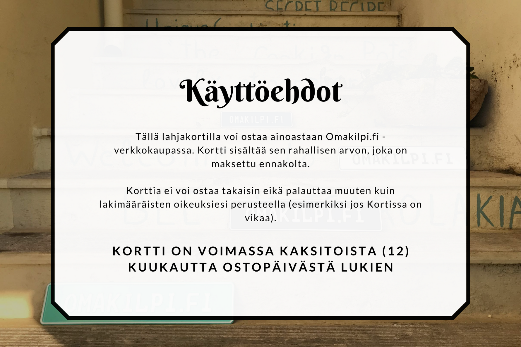 Lahjakortti Omakilpi verkkokauppaan on vihdoin täällä. Lahjakortit toimivat erittäin hyvin tilanteessa, jossa ei haluta alkaa päättämään kilven tarkempia tietoja vaan halutaan antaa lahjakortin saajan itse päättää mieluinen kilpi.